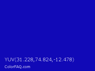 YUV 31.228,74.824,-12.478 Color is a normal indigo color and the nearest color is Zaffre #0014a8. Hex code #1109b7 and RGB value is rgb(17,9,183). In RGB color space, this color is composed of 7% red, 4% green, 72% blue, In CMYK color space, this color is composed of 91% cyan, 95% magenta, 0% yellow , 28% black , In HSL color space, this color has a hue angle of 243° , 91% saturation and 38% lightness.