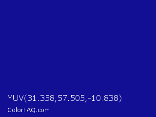 YUV 31.358,57.505,-10.838 Color is a normal indigo color and the nearest color is Ultramarine #120a8f. Hex code #130f94 and RGB value is rgb(19,15,148). In RGB color space, this color is composed of 7% red, 6% green, 58% blue, In CMYK color space, this color is composed of 87% cyan, 90% magenta, 0% yellow , 42% black , In HSL color space, this color has a hue angle of 242° , 82% saturation and 32% lightness.