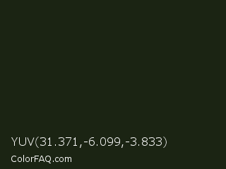 YUV 31.371,-6.099,-3.833 Color is a very dark green color and the nearest color is Rangoon Green #1c1e13. Hex code #1b2413 and RGB value is rgb(27,36,19). In RGB color space, this color is composed of 11% red, 14% green, 7% blue, In CMYK color space, this color is composed of 25% cyan, 0% magenta, 47% yellow , 86% black , In HSL color space, this color has a hue angle of 92° , 31% saturation and 11% lightness.