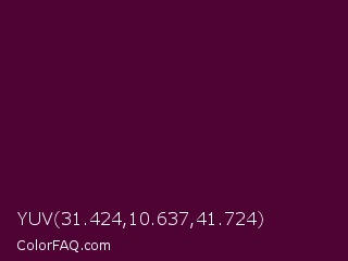 YUV 31.424,10.637,41.724 Color is a very dark magenta color and the nearest color is Blackberry #4d0135. Hex code #4f0335 and RGB value is rgb(79,3,53). In RGB color space, this color is composed of 31% red, 1% green, 21% blue, In CMYK color space, this color is composed of 0% cyan, 96% magenta, 33% yellow , 69% black , In HSL color space, this color has a hue angle of 321° , 93% saturation and 16% lightness.