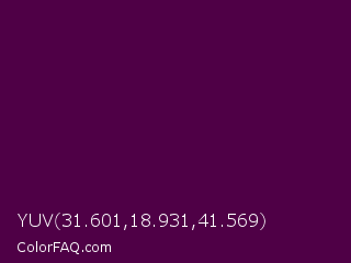 YUV 31.601,18.931,41.569 Color is a very dark magenta color and the nearest color is Loulou #460b41. Hex code #4f0046 and RGB value is rgb(79,-0,70). In RGB color space, this color is composed of 31% red, 0% green, 27% blue, In CMYK color space, this color is composed of 0% cyan, 100% magenta, 11% yellow , 69% black , In HSL color space, this color has a hue angle of 307° , 100% saturation and 15% lightness.