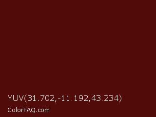 YUV 31.702,-11.192,43.234 Color is a very dark red color and the nearest color is Mahogany #4e0606. Hex code #510b09 and RGB value is rgb(81,11,9). In RGB color space, this color is composed of 32% red, 4% green, 4% blue, In CMYK color space, this color is composed of 0% cyan, 86% magenta, 89% yellow , 68% black , In HSL color space, this color has a hue angle of 2° , 80% saturation and 18% lightness.