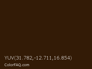 YUV 31.782,-12.711,16.854 Color is a very dark orange color and the nearest color is Clinker #371d09. Hex code #331b06 and RGB value is rgb(51,27,6). In RGB color space, this color is composed of 20% red, 11% green, 2% blue, In CMYK color space, this color is composed of 0% cyan, 47% magenta, 88% yellow , 80% black , In HSL color space, this color has a hue angle of 28° , 79% saturation and 11% lightness.