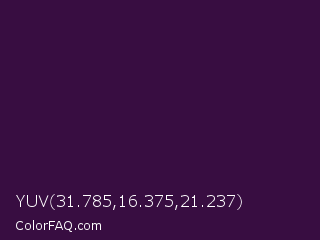 YUV 31.785,16.375,21.237 Color is a very dark purple color and the nearest color is Valentino #350e42. Hex code #380d41 and RGB value is rgb(56,13,65). In RGB color space, this color is composed of 22% red, 5% green, 25% blue, In CMYK color space, this color is composed of 14% cyan, 80% magenta, 0% yellow , 75% black , In HSL color space, this color has a hue angle of 290° , 67% saturation and 15% lightness.