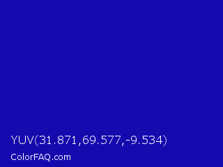 YUV 31.871,69.577,-9.534 Color is a normal indigo color and the nearest color is Zaffre #0014a8. Hex code #150aad and RGB value is rgb(21,10,173). In RGB color space, this color is composed of 8% red, 4% green, 68% blue, In CMYK color space, this color is composed of 88% cyan, 94% magenta, 0% yellow , 32% black , In HSL color space, this color has a hue angle of 244° , 89% saturation and 36% lightness.