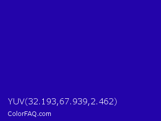 YUV 32.193,67.939,2.462 Color is a normal indigo color and the nearest color is Ultramarine #120a8f. Hex code #2304aa and RGB value is rgb(35,4,170). In RGB color space, this color is composed of 14% red, 2% green, 67% blue, In CMYK color space, this color is composed of 79% cyan, 98% magenta, 0% yellow , 33% black , In HSL color space, this color has a hue angle of 251° , 95% saturation and 34% lightness.