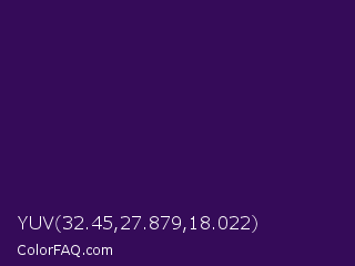 YUV 32.45,27.879,18.022 Color is a very dark purple color and the nearest color is Jagger #350e57. Hex code #350b59 and RGB value is rgb(53,11,89). In RGB color space, this color is composed of 21% red, 4% green, 35% blue, In CMYK color space, this color is composed of 40% cyan, 88% magenta, 0% yellow , 65% black , In HSL color space, this color has a hue angle of 272° , 78% saturation and 20% lightness.