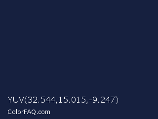 YUV 32.544,15.015,-9.247 Color is a very dark blue color and the nearest color is Big Stone #162a40. Hex code #16203f and RGB value is rgb(22,32,63). In RGB color space, this color is composed of 9% red, 13% green, 25% blue, In CMYK color space, this color is composed of 65% cyan, 49% magenta, 0% yellow , 75% black , In HSL color space, this color has a hue angle of 225° , 48% saturation and 17% lightness.