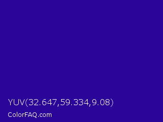 YUV 32.647,59.334,9.08 Color is a normal indigo color and the nearest color is Blue Gem #2c0e8c. Hex code #2b0499 and RGB value is rgb(43,4,153). In RGB color space, this color is composed of 17% red, 2% green, 60% blue, In CMYK color space, this color is composed of 72% cyan, 97% magenta, 0% yellow , 40% black , In HSL color space, this color has a hue angle of 256° , 95% saturation and 31% lightness.