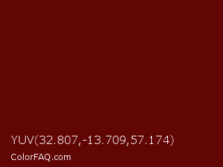 YUV 32.807,-13.709,57.174 Color is a very dark red color and the nearest color is Rosewood #65000b. Hex code #620505 and RGB value is rgb(98,5,5). In RGB color space, this color is composed of 38% red, 2% green, 2% blue, In CMYK color space, this color is composed of 0% cyan, 95% magenta, 95% yellow , 62% black , In HSL color space, this color has a hue angle of 0° , 90% saturation and 20% lightness.