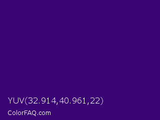 YUV 32.914,40.961,22 Color is a dark violet color and the nearest color is Blue Diamond #380474. Hex code #3a0474 and RGB value is rgb(58,4,116). In RGB color space, this color is composed of 23% red, 2% green, 45% blue, In CMYK color space, this color is composed of 50% cyan, 97% magenta, 0% yellow , 55% black , In HSL color space, this color has a hue angle of 269° , 93% saturation and 24% lightness.
