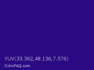 YUV 33.362,48.136,7.576 Color is a dark indigo color and the nearest color is Blue Gem #2c0e8c. Hex code #2a0a83 and RGB value is rgb(42,10,131). In RGB color space, this color is composed of 16% red, 4% green, 51% blue, In CMYK color space, this color is composed of 68% cyan, 92% magenta, 0% yellow , 49% black , In HSL color space, this color has a hue angle of 256° , 86% saturation and 28% lightness.