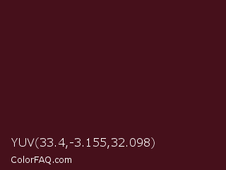 YUV 33.4,-3.155,32.098 Color is a very dark red color and the nearest color is Cab Sav #4d0a18. Hex code #46101b and RGB value is rgb(70,16,27). In RGB color space, this color is composed of 27% red, 6% green, 11% blue, In CMYK color space, this color is composed of 0% cyan, 77% magenta, 61% yellow , 73% black , In HSL color space, this color has a hue angle of 348° , 63% saturation and 17% lightness.