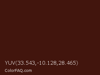YUV 33.543,-10.128,28.465 Color is a very dark red color and the nearest color is Van Cleef #49170c. Hex code #42150d and RGB value is rgb(66,21,13). In RGB color space, this color is composed of 26% red, 8% green, 5% blue, In CMYK color space, this color is composed of 0% cyan, 68% magenta, 80% yellow , 74% black , In HSL color space, this color has a hue angle of 9° , 67% saturation and 15% lightness.