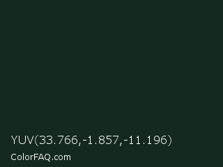 YUV 33.766,-1.857,-11.196 Color is a very dark green color and the nearest color is Dark Jungle Green #1a2421. Hex code #15291e and RGB value is rgb(21,41,30). In RGB color space, this color is composed of 8% red, 16% green, 12% blue, In CMYK color space, this color is composed of 49% cyan, 0% magenta, 27% yellow , 84% black , In HSL color space, this color has a hue angle of 147° , 32% saturation and 12% lightness.