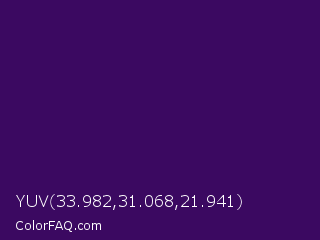 YUV 33.982,31.068,21.941 Color is a very dark purple color and the nearest color is Jagger #350e57. Hex code #3b0961 and RGB value is rgb(59,9,97). In RGB color space, this color is composed of 23% red, 4% green, 38% blue, In CMYK color space, this color is composed of 39% cyan, 91% magenta, 0% yellow , 62% black , In HSL color space, this color has a hue angle of 274° , 83% saturation and 21% lightness.