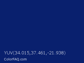 YUV 34.015,37.461,-21.938 Color is a dark blue color and the nearest color is Deep Sapphire #082567. Hex code #09206e and RGB value is rgb(9,32,110). In RGB color space, this color is composed of 4% red, 13% green, 43% blue, In CMYK color space, this color is composed of 92% cyan, 71% magenta, 0% yellow , 57% black , In HSL color space, this color has a hue angle of 226° , 85% saturation and 23% lightness.