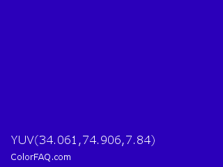 YUV 34.061,74.906,7.84 Color is a normal indigo color and the nearest color is Interdimensional Blue #360ccc. Hex code #2b00ba and RGB value is rgb(43,-0,186). In RGB color space, this color is composed of 17% red, 0% green, 73% blue, In CMYK color space, this color is composed of 77% cyan, 100% magenta, 0% yellow , 27% black , In HSL color space, this color has a hue angle of 254° , 100% saturation and 36% lightness.