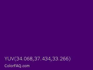 YUV 34.068,37.434,33.266 Color is a very dark purple color and the nearest color is Blue Diamond #380474. Hex code #48006e and RGB value is rgb(72,-0,110). In RGB color space, this color is composed of 28% red, 0% green, 43% blue, In CMYK color space, this color is composed of 35% cyan, 100% magenta, 0% yellow , 57% black , In HSL color space, this color has a hue angle of 279° , 100% saturation and 22% lightness.