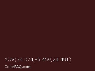 YUV 34.074,-5.459,24.491 Color is a very dark red color and the nearest color is Dark Sienna #3c1414. Hex code #3e1617 and RGB value is rgb(62,22,23). In RGB color space, this color is composed of 24% red, 9% green, 9% blue, In CMYK color space, this color is composed of 0% cyan, 65% magenta, 63% yellow , 76% black , In HSL color space, this color has a hue angle of 359° , 48% saturation and 16% lightness.