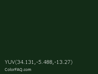 YUV 34.131,-5.488,-13.27 Color is a very dark green color and the nearest color is Bush #0d2e1c. Hex code #132c17 and RGB value is rgb(19,44,23). In RGB color space, this color is composed of 7% red, 17% green, 9% blue, In CMYK color space, this color is composed of 57% cyan, 0% magenta, 48% yellow , 83% black , In HSL color space, this color has a hue angle of 130° , 40% saturation and 12% lightness.