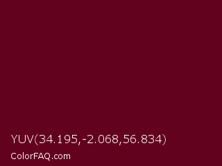 YUV 34.195,-2.068,56.834 Color is a very dark rose color and the nearest color is Bordeaux #5c0120. Hex code #63021e and RGB value is rgb(99,2,30). In RGB color space, this color is composed of 39% red, 1% green, 12% blue, In CMYK color space, this color is composed of 0% cyan, 98% magenta, 70% yellow , 61% black , In HSL color space, this color has a hue angle of 343° , 96% saturation and 20% lightness.