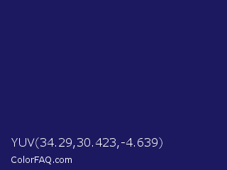 YUV 34.29,30.423,-4.639 Color is a dark indigo color and the nearest color is Lucky Point #1a1a68. Hex code #1d1960 and RGB value is rgb(29,25,96). In RGB color space, this color is composed of 11% red, 10% green, 38% blue, In CMYK color space, this color is composed of 70% cyan, 74% magenta, 0% yellow , 62% black , In HSL color space, this color has a hue angle of 243° , 59% saturation and 24% lightness.