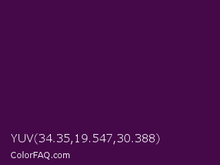 YUV 34.35,19.547,30.388 Color is a very dark magenta color and the nearest color is Loulou #460b41. Hex code #45094a and RGB value is rgb(69,9,74). In RGB color space, this color is composed of 27% red, 4% green, 29% blue, In CMYK color space, this color is composed of 7% cyan, 88% magenta, 0% yellow , 71% black , In HSL color space, this color has a hue angle of 295° , 78% saturation and 16% lightness.