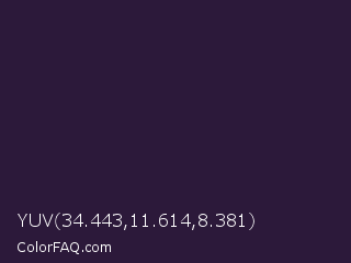 YUV 34.443,11.614,8.381 Color is a very dark purple color and the nearest color is Dark Purple #301934. Hex code #2c193a and RGB value is rgb(44,25,58). In RGB color space, this color is composed of 17% red, 10% green, 23% blue, In CMYK color space, this color is composed of 24% cyan, 57% magenta, 0% yellow , 77% black , In HSL color space, this color has a hue angle of 275° , 40% saturation and 16% lightness.