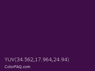 YUV 34.562,17.964,24.94 Color is a very dark magenta color and the nearest color is Loulou #460b41. Hex code #3f0d47 and RGB value is rgb(63,13,71). In RGB color space, this color is composed of 25% red, 5% green, 28% blue, In CMYK color space, this color is composed of 11% cyan, 82% magenta, 0% yellow , 72% black , In HSL color space, this color has a hue angle of 292° , 69% saturation and 16% lightness.