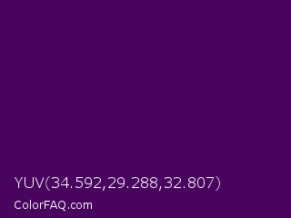YUV 34.592,29.288,32.807 Color is a very dark purple color and the nearest color is Clairvoyant #480656. Hex code #48045e and RGB value is rgb(72,4,94). In RGB color space, this color is composed of 28% red, 2% green, 37% blue, In CMYK color space, this color is composed of 23% cyan, 96% magenta, 0% yellow , 63% black , In HSL color space, this color has a hue angle of 285° , 92% saturation and 19% lightness.