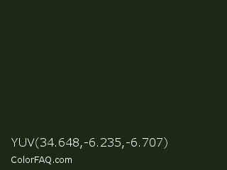 YUV 34.648,-6.235,-6.707 Color is a very dark green color and the nearest color is Seaweed #1b2f11. Hex code #1b2916 and RGB value is rgb(27,41,22). In RGB color space, this color is composed of 11% red, 16% green, 9% blue, In CMYK color space, this color is composed of 34% cyan, 0% magenta, 46% yellow , 84% black , In HSL color space, this color has a hue angle of 104° , 30% saturation and 12% lightness.