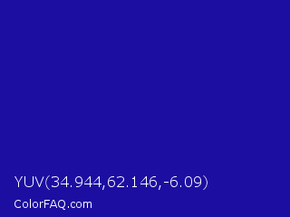 YUV 34.944,62.146,-6.09 Color is a normal indigo color and the nearest color is Ultramarine #120a8f. Hex code #1c0ea1 and RGB value is rgb(28,14,161). In RGB color space, this color is composed of 11% red, 5% green, 63% blue, In CMYK color space, this color is composed of 83% cyan, 91% magenta, 0% yellow , 37% black , In HSL color space, this color has a hue angle of 246° , 84% saturation and 34% lightness.