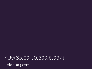 YUV 35.09,10.309,6.937 Color is a very dark purple color and the nearest color is Dark Purple #301934. Hex code #2b1b38 and RGB value is rgb(43,27,56). In RGB color space, this color is composed of 17% red, 11% green, 22% blue, In CMYK color space, this color is composed of 23% cyan, 52% magenta, 0% yellow , 78% black , In HSL color space, this color has a hue angle of 273° , 35% saturation and 16% lightness.