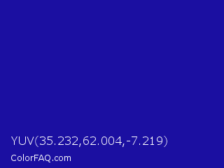 YUV 35.232,62.004,-7.219 Color is a normal indigo color and the nearest color is Ultramarine #120a8f. Hex code #1b0fa1 and RGB value is rgb(27,15,161). In RGB color space, this color is composed of 11% red, 6% green, 63% blue, In CMYK color space, this color is composed of 83% cyan, 91% magenta, 0% yellow , 37% black , In HSL color space, this color has a hue angle of 245° , 83% saturation and 35% lightness.