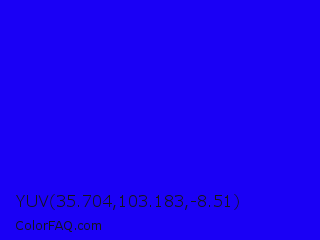 YUV 35.704,103.183,-8.51 Color is a normal indigo color and the nearest color is Blue #0000ff. Hex code #1a00f5 and RGB value is rgb(26,-0,245). In RGB color space, this color is composed of 10% red, 0% green, 96% blue, In CMYK color space, this color is composed of 89% cyan, 100% magenta, 0% yellow , 4% black , In HSL color space, this color has a hue angle of 246° , 100% saturation and 48% lightness.