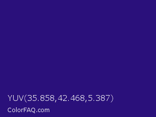 YUV 35.858,42.468,5.387 Color is a dark indigo color and the nearest color is Persian Indigo #32127a. Hex code #2a107a and RGB value is rgb(42,16,122). In RGB color space, this color is composed of 16% red, 6% green, 48% blue, In CMYK color space, this color is composed of 66% cyan, 87% magenta, 0% yellow , 52% black , In HSL color space, this color has a hue angle of 255° , 77% saturation and 27% lightness.