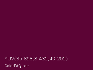 YUV 35.898,8.431,49.201 Color is a very dark magenta color and the nearest color is Mulberry Wood #5c0536. Hex code #5c0435 and RGB value is rgb(92,4,53). In RGB color space, this color is composed of 36% red, 2% green, 21% blue, In CMYK color space, this color is composed of 0% cyan, 96% magenta, 42% yellow , 64% black , In HSL color space, this color has a hue angle of 327° , 92% saturation and 19% lightness.