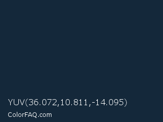 YUV 36.072,10.811,-14.095 Color is a very dark blue color and the nearest color is Big Stone #162a40. Hex code #14283a and RGB value is rgb(20,40,58). In RGB color space, this color is composed of 8% red, 16% green, 23% blue, In CMYK color space, this color is composed of 66% cyan, 31% magenta, 0% yellow , 77% black , In HSL color space, this color has a hue angle of 208° , 49% saturation and 15% lightness.