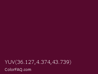 YUV 36.127,4.374,43.739 Color is a very dark rose color and the nearest color is Mulberry Wood #5c0536. Hex code #56092d and RGB value is rgb(86,9,45). In RGB color space, this color is composed of 34% red, 4% green, 18% blue, In CMYK color space, this color is composed of 0% cyan, 90% magenta, 48% yellow , 66% black , In HSL color space, this color has a hue angle of 332° , 81% saturation and 19% lightness.