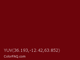 YUV 36.193,-12.42,63.852 Color is a very dark red color and the nearest color is Venetian Red #72010f. Hex code #6d040b and RGB value is rgb(109,4,11). In RGB color space, this color is composed of 43% red, 2% green, 4% blue, In CMYK color space, this color is composed of 0% cyan, 96% magenta, 90% yellow , 57% black , In HSL color space, this color has a hue angle of 356° , 93% saturation and 22% lightness.
