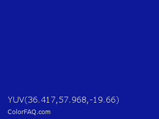 YUV 36.417,57.968,-19.66 Color is a normal blue color and the nearest color is Indigo Dye #091f92. Hex code #0e199a and RGB value is rgb(14,25,154). In RGB color space, this color is composed of 5% red, 10% green, 60% blue, In CMYK color space, this color is composed of 91% cyan, 84% magenta, 0% yellow , 40% black , In HSL color space, this color has a hue angle of 235° , 83% saturation and 33% lightness.