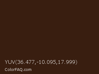 YUV 36.477,-10.095,17.999 Color is a very dark orange color and the nearest color is Sambuca #3a2010. Hex code #391e10 and RGB value is rgb(57,30,16). In RGB color space, this color is composed of 22% red, 12% green, 6% blue, In CMYK color space, this color is composed of 0% cyan, 47% magenta, 72% yellow , 78% black , In HSL color space, this color has a hue angle of 20° , 56% saturation and 14% lightness.