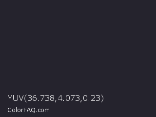 YUV 36.738,4.073,0.23 Color is a very dark indigo color and the nearest color is Shark #25272c. Hex code #25232d and RGB value is rgb(37,35,45). In RGB color space, this color is composed of 15% red, 14% green, 18% blue, In CMYK color space, this color is composed of 18% cyan, 22% magenta, 0% yellow , 82% black , In HSL color space, this color has a hue angle of 252° , 13% saturation and 16% lightness.