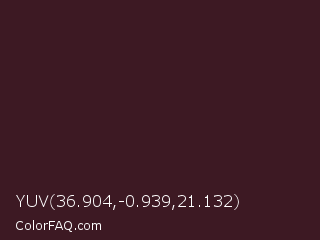 YUV 36.904,-0.939,21.132 Color is a very dark rose color and the nearest color is Jon #3b1f1f. Hex code #3d1923 and RGB value is rgb(61,25,35). In RGB color space, this color is composed of 24% red, 10% green, 14% blue, In CMYK color space, this color is composed of 0% cyan, 59% magenta, 43% yellow , 76% black , In HSL color space, this color has a hue angle of 343° , 42% saturation and 17% lightness.