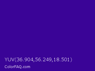 YUV 36.904,56.249,18.501 Color is a dark violet color and the nearest color is Blue Gem #2c0e8c. Hex code #3a0497 and RGB value is rgb(58,4,151). In RGB color space, this color is composed of 23% red, 2% green, 59% blue, In CMYK color space, this color is composed of 62% cyan, 97% magenta, 0% yellow , 41% black , In HSL color space, this color has a hue angle of 262° , 95% saturation and 30% lightness.