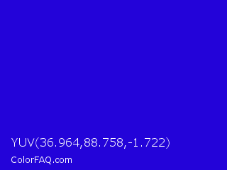 YUV 36.964,88.758,-1.722 Color is a normal indigo color and the nearest color is Interdimensional Blue #360ccc. Hex code #2303d9 and RGB value is rgb(35,3,217). In RGB color space, this color is composed of 14% red, 1% green, 85% blue, In CMYK color space, this color is composed of 84% cyan, 99% magenta, 0% yellow , 15% black , In HSL color space, this color has a hue angle of 249° , 97% saturation and 43% lightness.