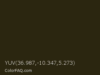 YUV 36.987,-10.347,5.273 Color is a very dark yellow color and the nearest color is Mikado #2d2510. Hex code #2b2610 and RGB value is rgb(43,38,16). In RGB color space, this color is composed of 17% red, 15% green, 6% blue, In CMYK color space, this color is composed of 0% cyan, 12% magenta, 63% yellow , 83% black , In HSL color space, this color has a hue angle of 49° , 46% saturation and 12% lightness.