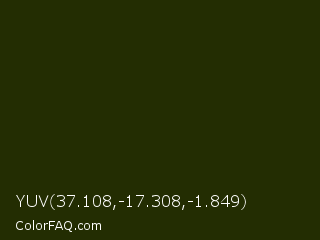 YUV 37.108,-17.308,-1.849 Color is a almost black lime color and the nearest color is Deep Forest Green #182d09. Hex code #232d02 and RGB value is rgb(35,45,2). In RGB color space, this color is composed of 14% red, 18% green, 1% blue, In CMYK color space, this color is composed of 22% cyan, 0% magenta, 96% yellow , 82% black , In HSL color space, this color has a hue angle of 74° , 91% saturation and 9% lightness.