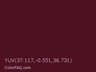 YUV 37.117,-0.551,36.731 Color is a very dark rose color and the nearest color is Cab Sav #4d0a18. Hex code #4f1024 and RGB value is rgb(79,16,36). In RGB color space, this color is composed of 31% red, 6% green, 14% blue, In CMYK color space, this color is composed of 0% cyan, 80% magenta, 54% yellow , 69% black , In HSL color space, this color has a hue angle of 341° , 66% saturation and 19% lightness.